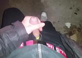 Trekkend aan zijn grote lul spuit hij sperma op de werkschoen